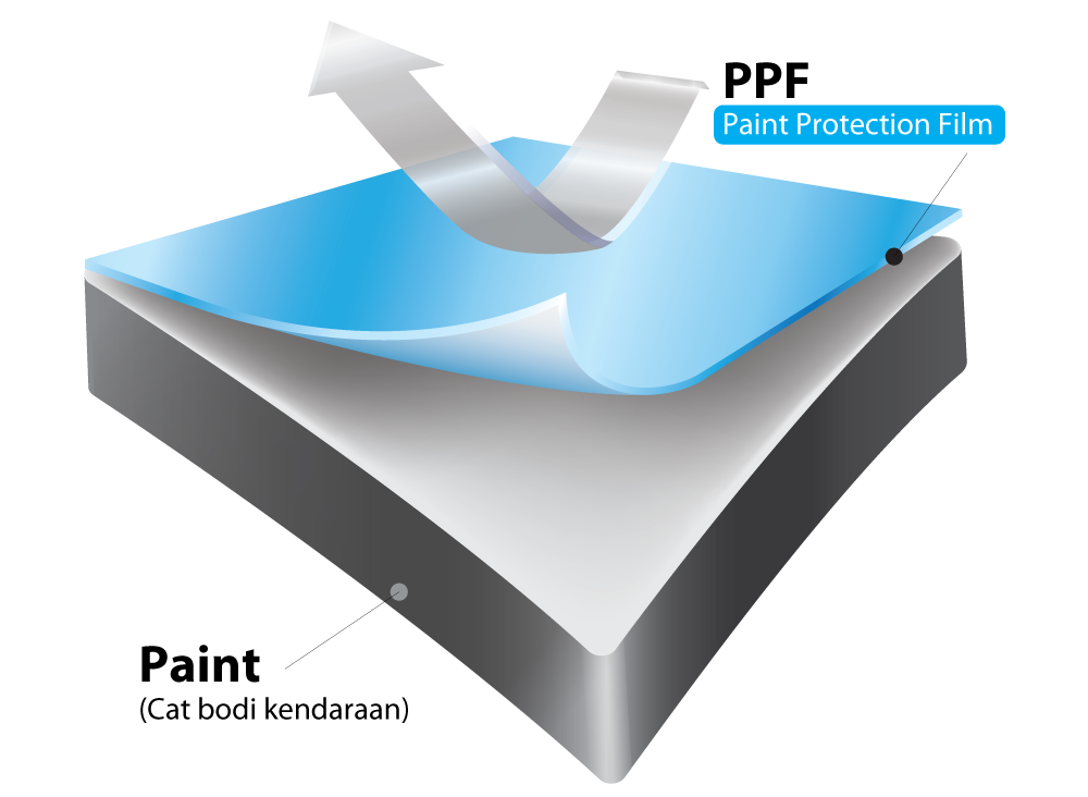 PPF (Paint Protection Film) adalah lapisan film transparan yang dipasang di atas cat, berfungsi sebagai perisai fisik untuk melindungi dari goresan, baret ringan, kerikil, dan kotoran.